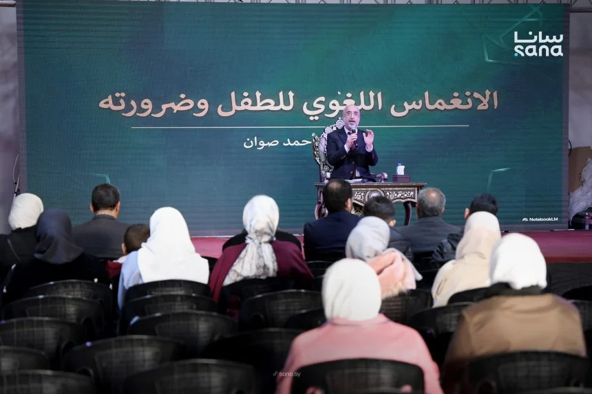 ألقى الدكتور أحمد صوان محاضرة ضمن فعاليات معرض دمشق الدولي للكتاب في دورته الاستثنائية، تناولت المحاضرة موضوع الانغماس اللغوي للطفل وضرورته، وأبرزت أهمية اللغة العربية وضرورة تعزيز استخدامها بين الأطفال منذ سن مبكرة لضمان تنمية مهاراتهم اللغوية والثقافية.