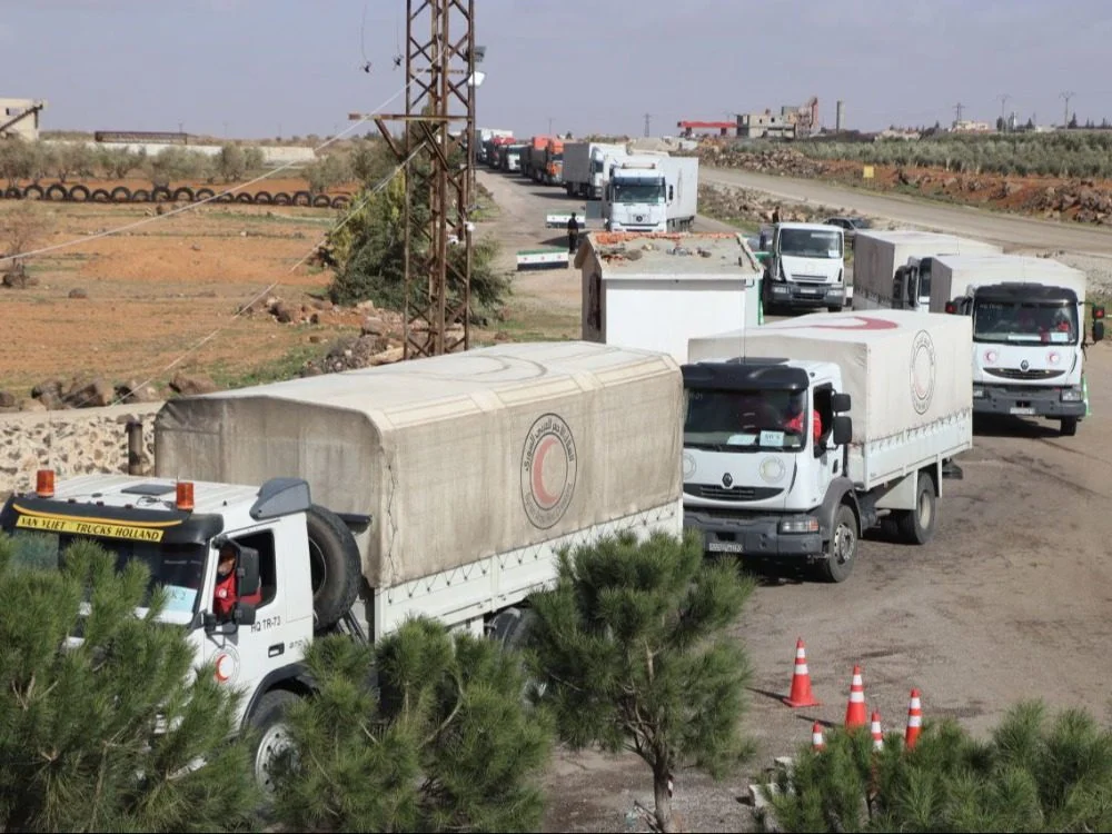 وفي 11 كانون الثاني الماضي، وصلت إلى محافظة السويداء قافلة مساعدات إنسانية تضم 27 شاحنة تابعة للهلال الأحمر، محمّلة بـ 402 طن من مادة الطحين، عبر معبر المتونة على طريق دمشق – السويداء.