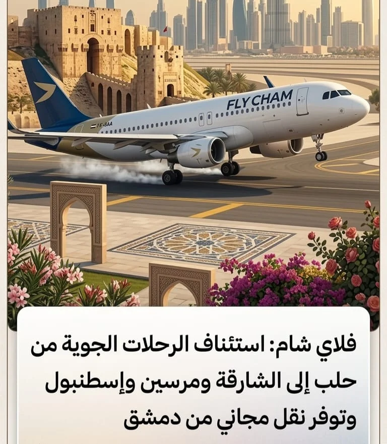أعلنت شركة الطيران “فلاي شام” استئناف تشغيل عدد من رحلاتها الجوية انطلاقاً من مطار حلب الدولي إلى كل من الشارقة ومرسين وإسطنبول (مطار صبيحة)، وذلك في إطار تلبية احتياجات المسافرين وتوفير بدائل سفر في ظل الظروف الراهنة التي تشهدها المنطقة.
