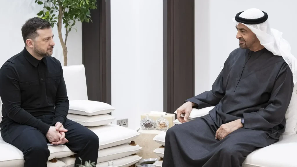 وكان الرئيس الأوكراني قد وصل البلاد في وقت سابق، واستُقبل في المطار من قبل وزير الطاقة والبنية التحتية سهيل بن محمد المزروعي وعدد من المسؤولين.