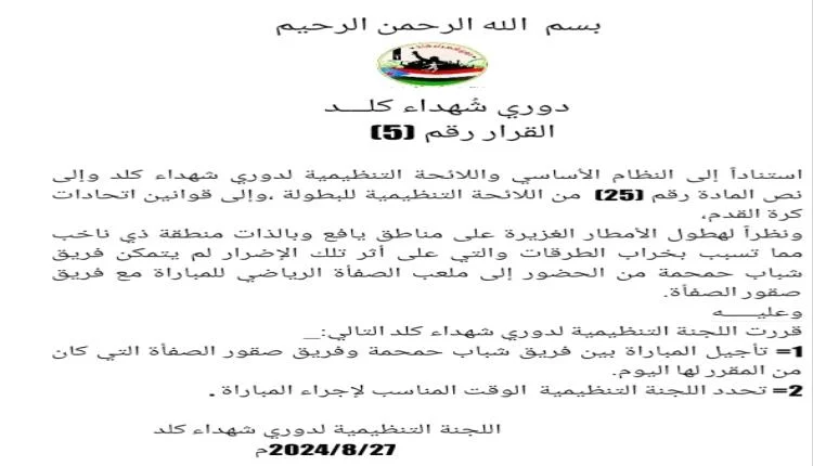 تأجيل مباراة صقور الصفأة وشباب حمحمة عن موعدها المقرر عصر اليوم