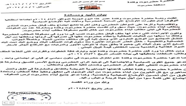 حاضرة حضرموت وكندة تؤيد خطوات حلف قبائل حضرموت