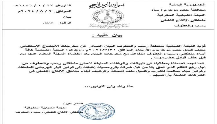 اللجنة الشبابية بمنطقة رسب والعطوف تؤيد مخرجات حلف قبائل حضرموت