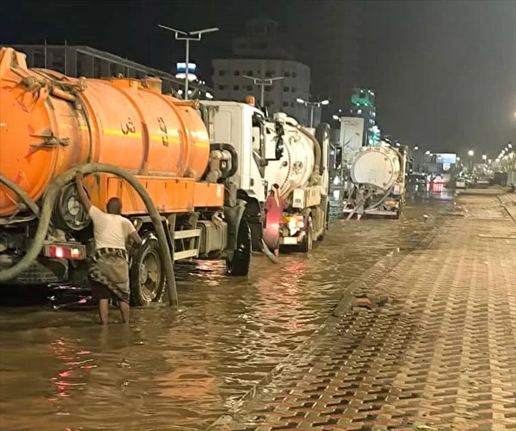 فرق الصرف الصحي بعدن تواصل شفط مياه الامطار في مديريات المنصورة والشيخ ودار سعد