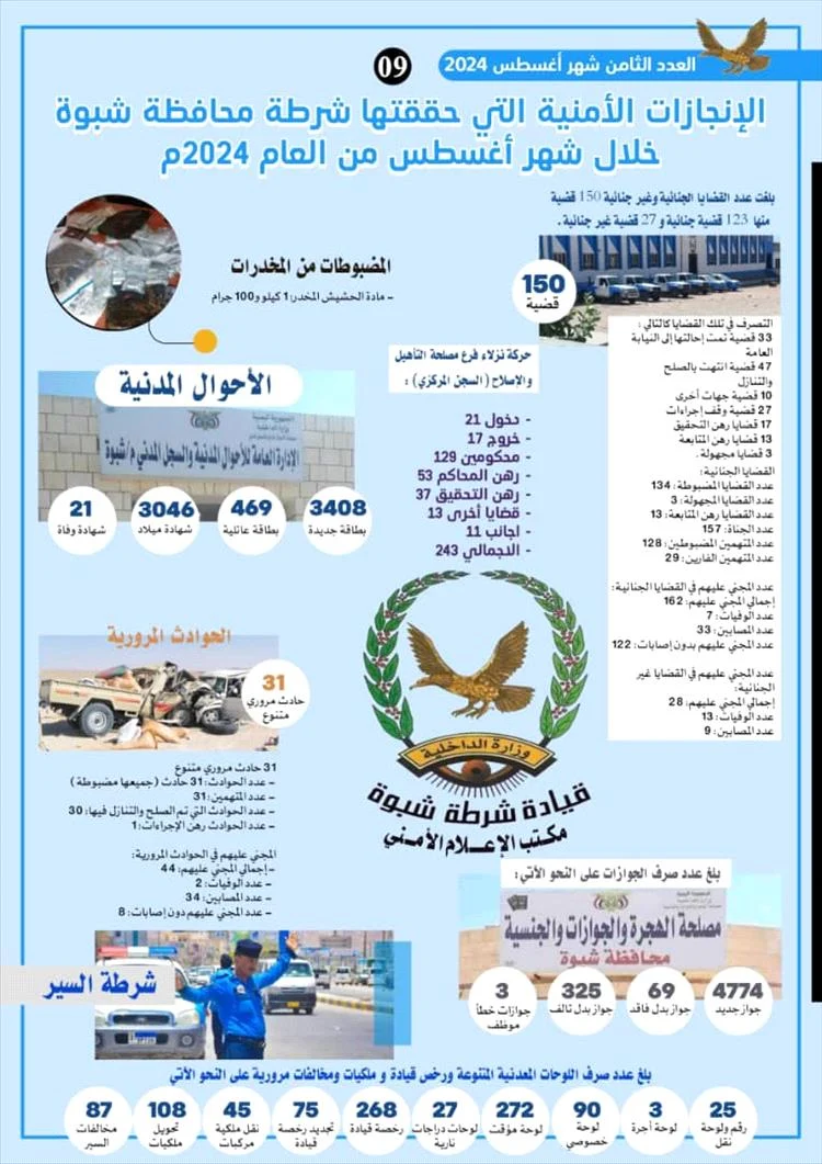 التقرير الشهري للإنجازات الأمنية التي حققتها شرطة محافظة شبوة خلال شهر أغسطس من العام الجاري 2024م