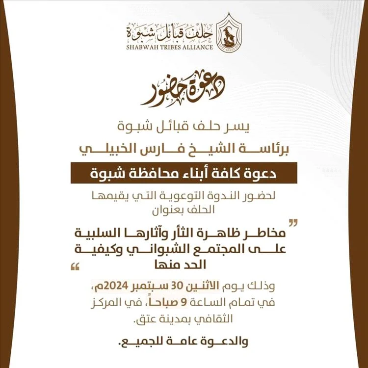 حلف قبائل شبوة يدعو لحضور ندوة توعوية حول مخاطر الثأر وتأثيراته السلبية