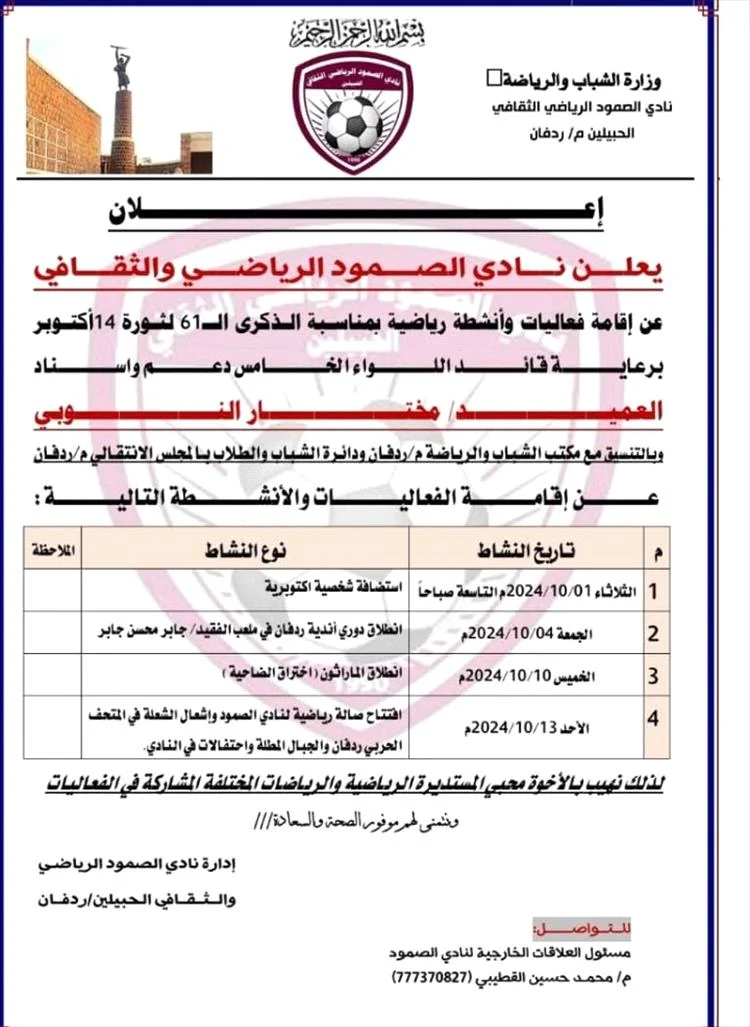 لحج…نادي الصمود الرياضي الثقافي بردفان يعلن عن إقامة عدد من الفعاليات الأكتوبربة